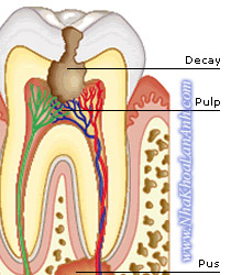 Hình: mô phỏng và x-quang của răng bị nhiễm trùng do sâu răng. Khi răng bị sâu và gây ra nhiễm trùng tủy, thần kinh và mạch máu trong tủy răng bị kích thích mạnh, làm tăng cảm giác đau và hạn chế hiệu quả của thuốc tê cũng như thuốc giảm đau, làm cho bạn cảm thấy “đau” nhiều hơn.